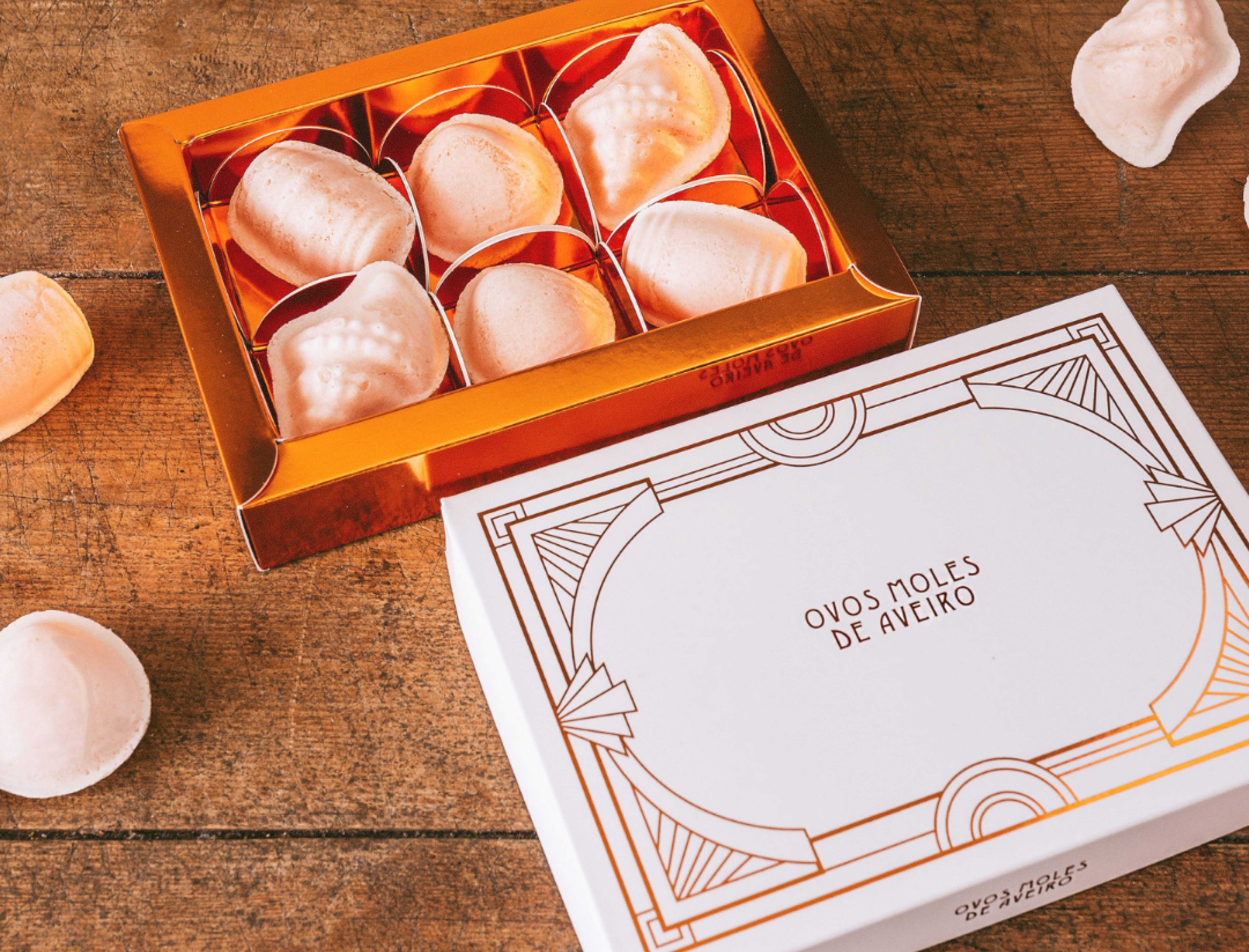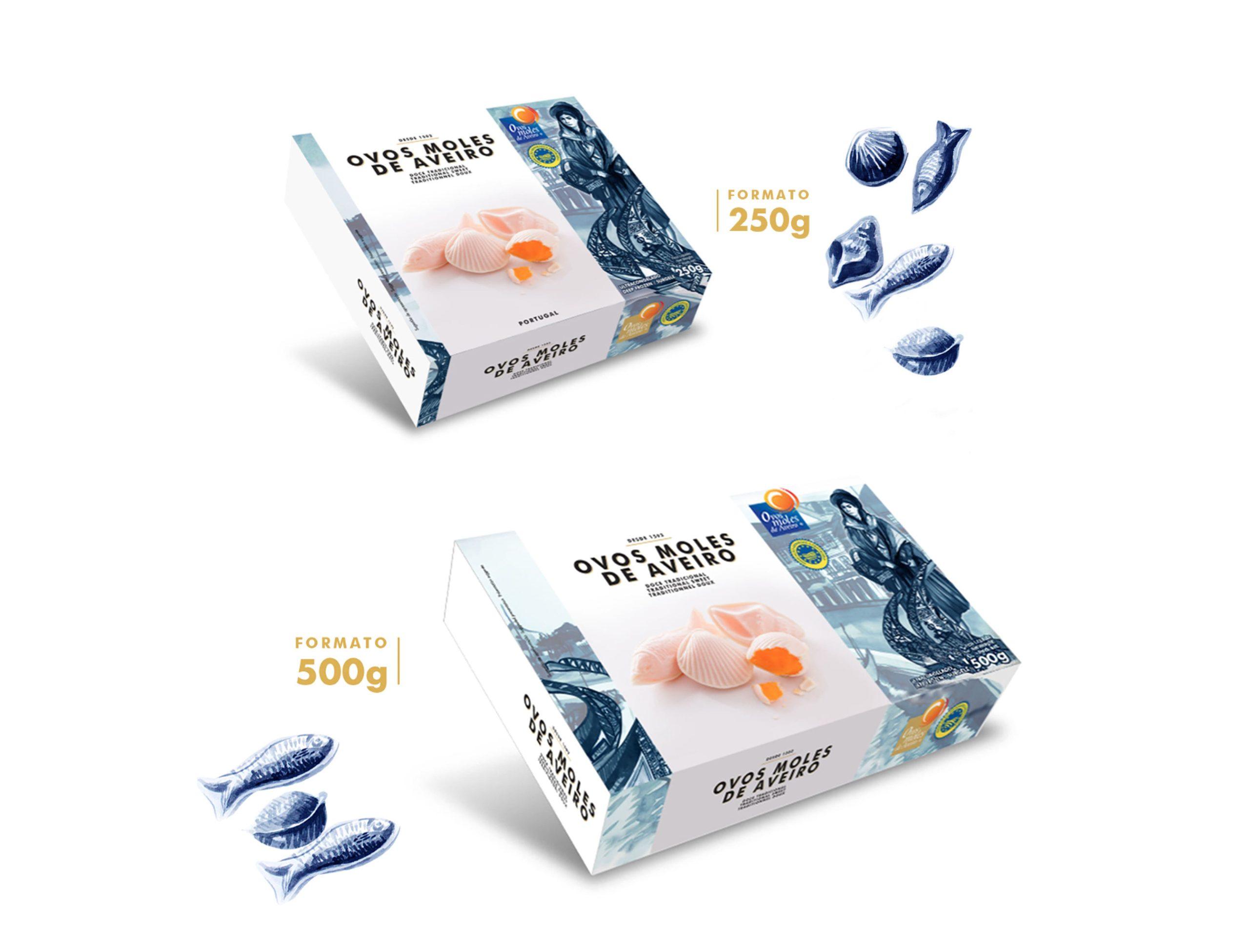Desenvolvemos o packaging design dos Ovos Moles de Aveiro para a APOMA, criando embalagens inspiradas na cultura marítima e no património local.