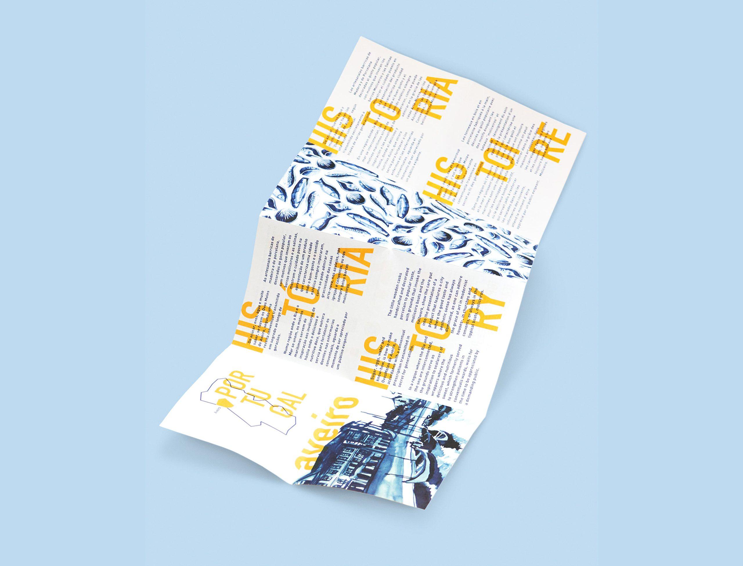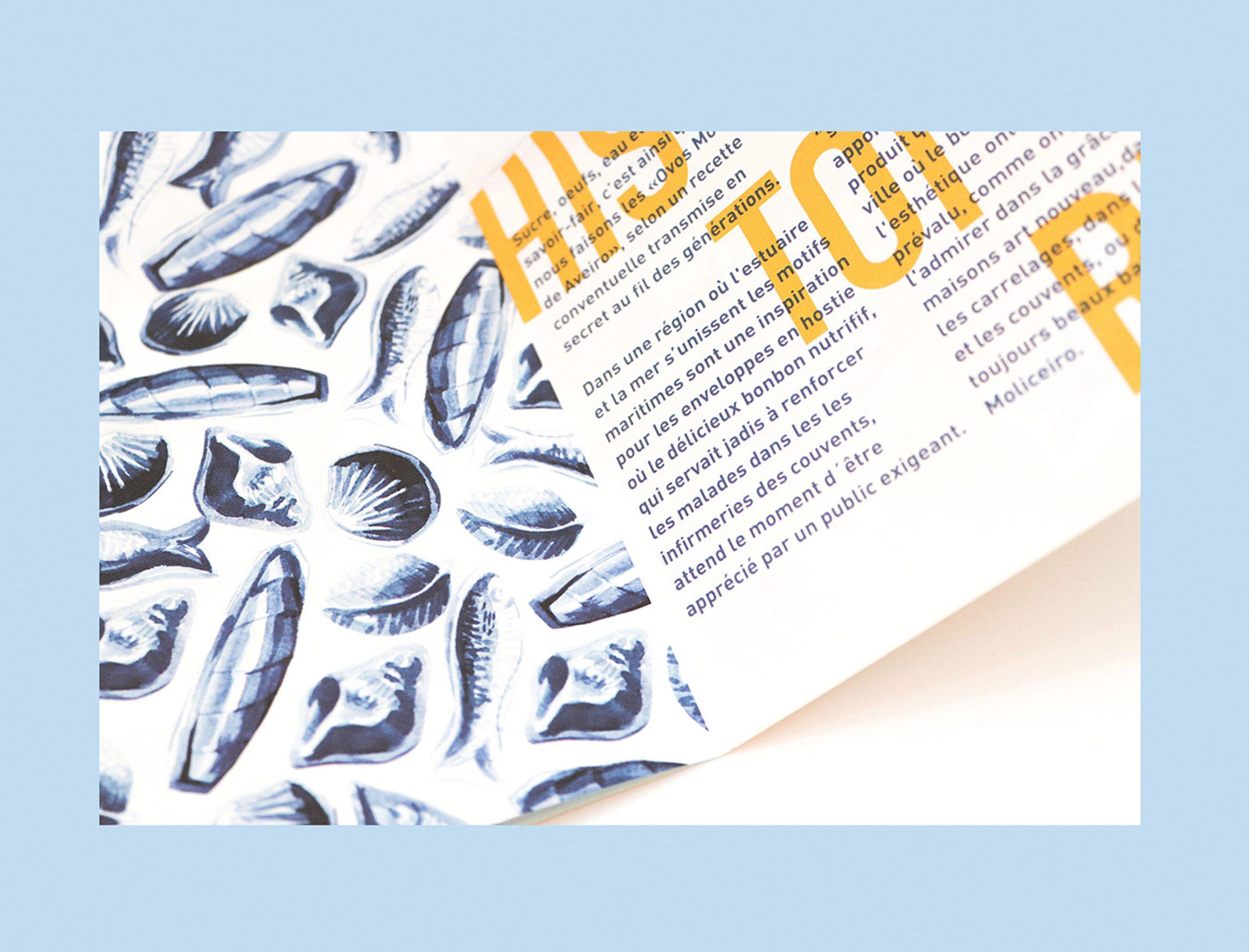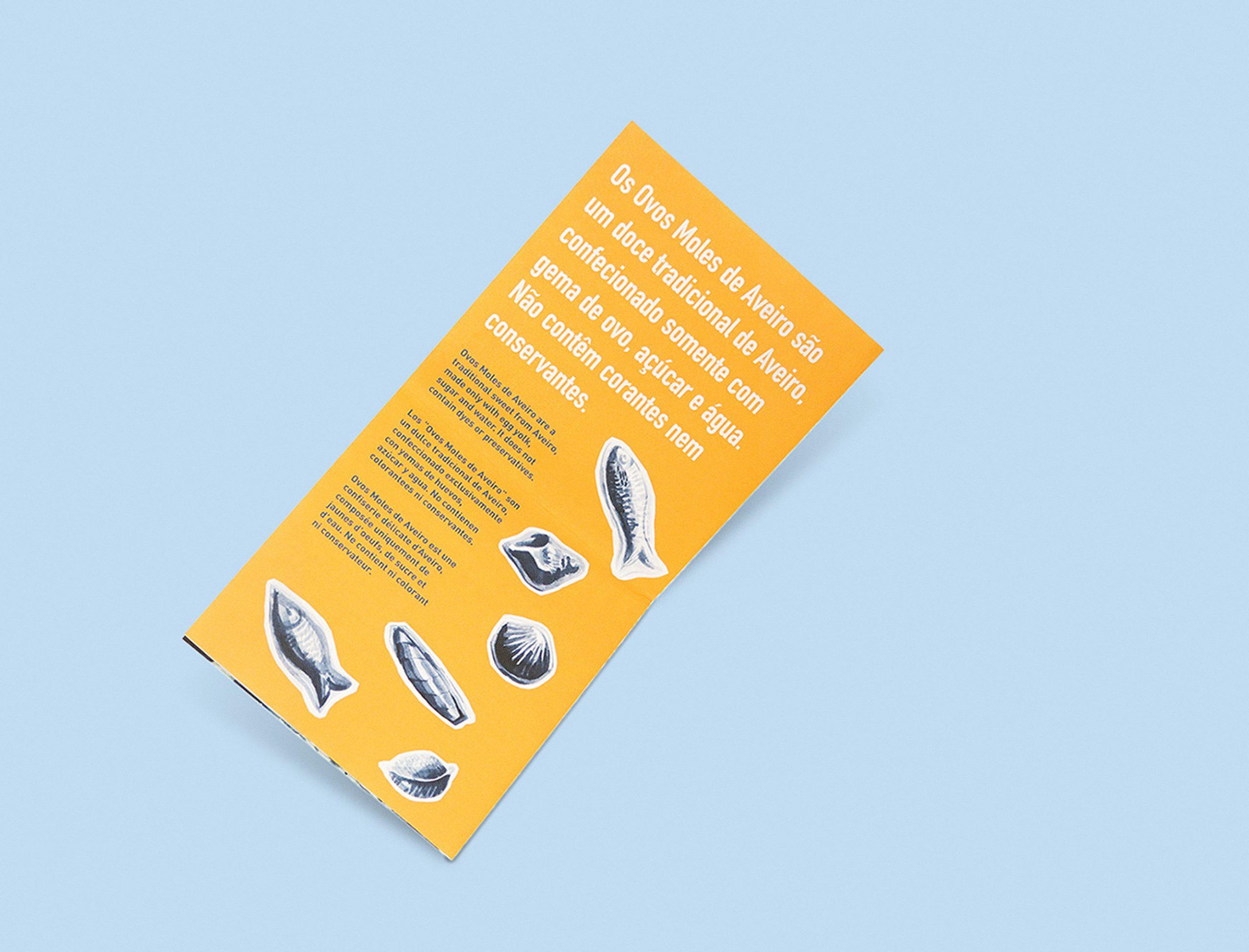 Trabalhámos com paleta cromática, tipografia e elementos gráficos coerentes com a narrativa cultural do produto. Além do packaging, desenvolvemos também um flyer informativo que contextualiza a história dos Ovos Moles, utilizando composição editorial, ilustração e tipografia para reforçar a divulgação do património gastronómico.