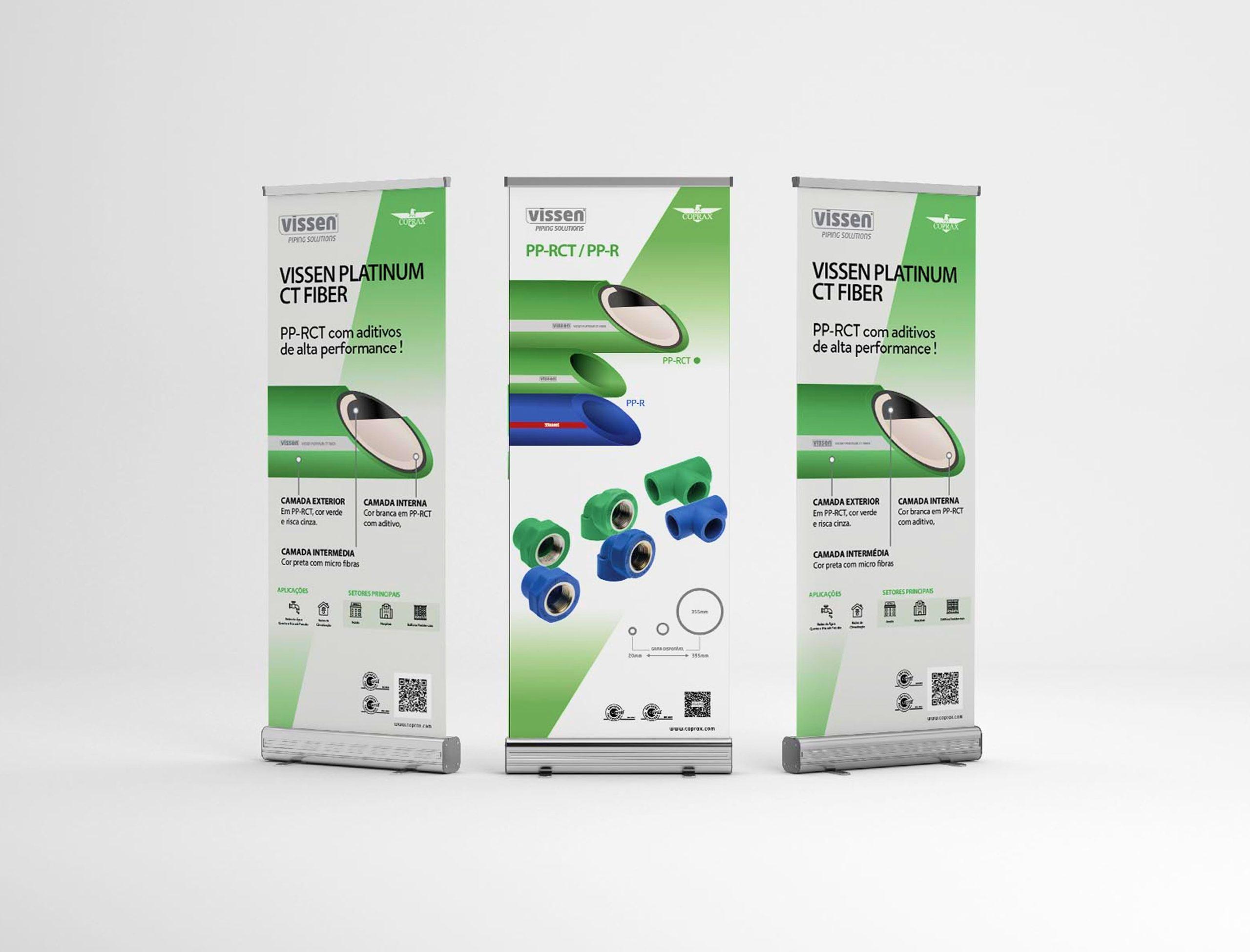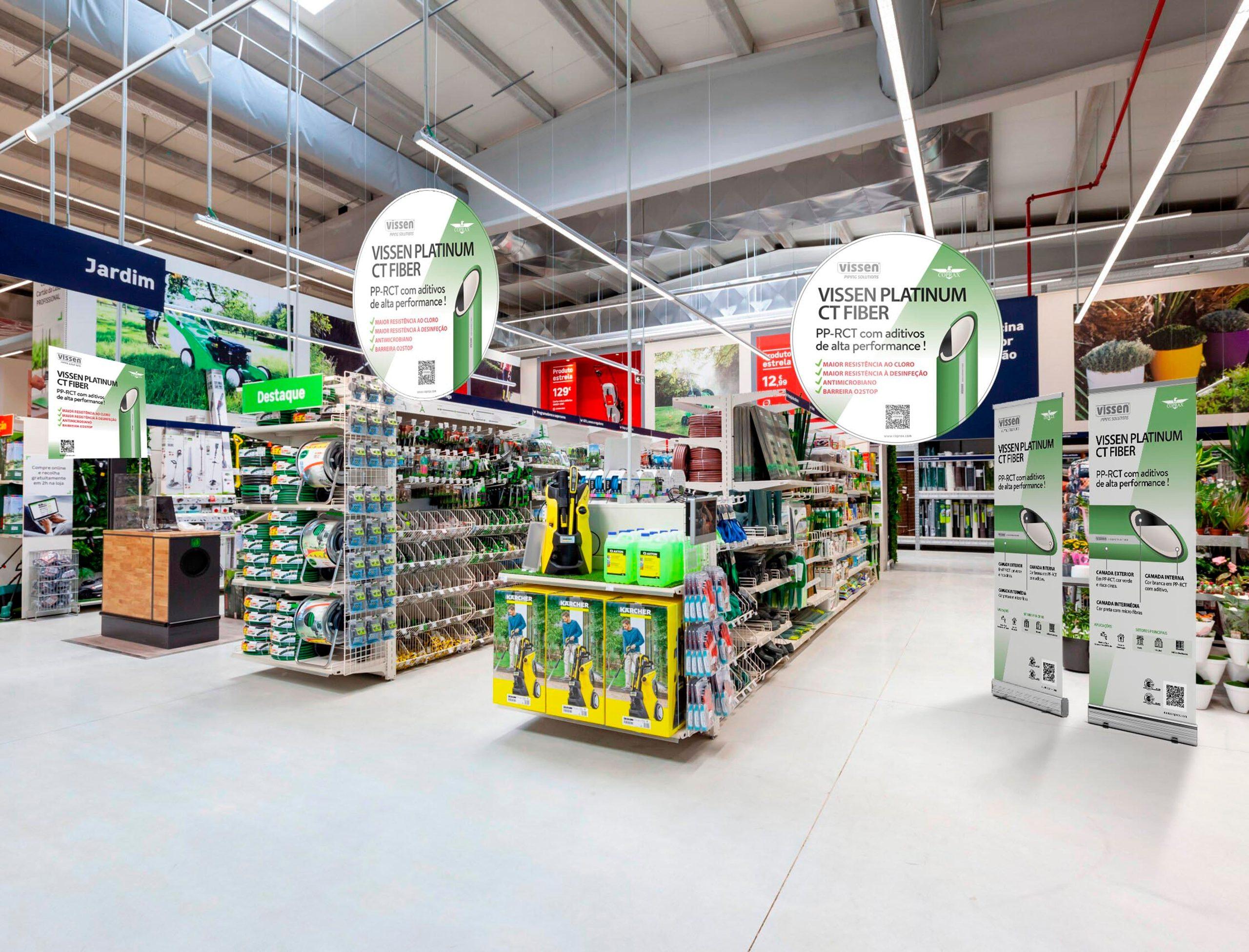 Foram criados catálogos técnicos, folhetos multilíngua, embalagens de componentes, sacos corporativos e expositores para lojas, garantindo coerência visual e reforço de marca nos canais de distribuição.