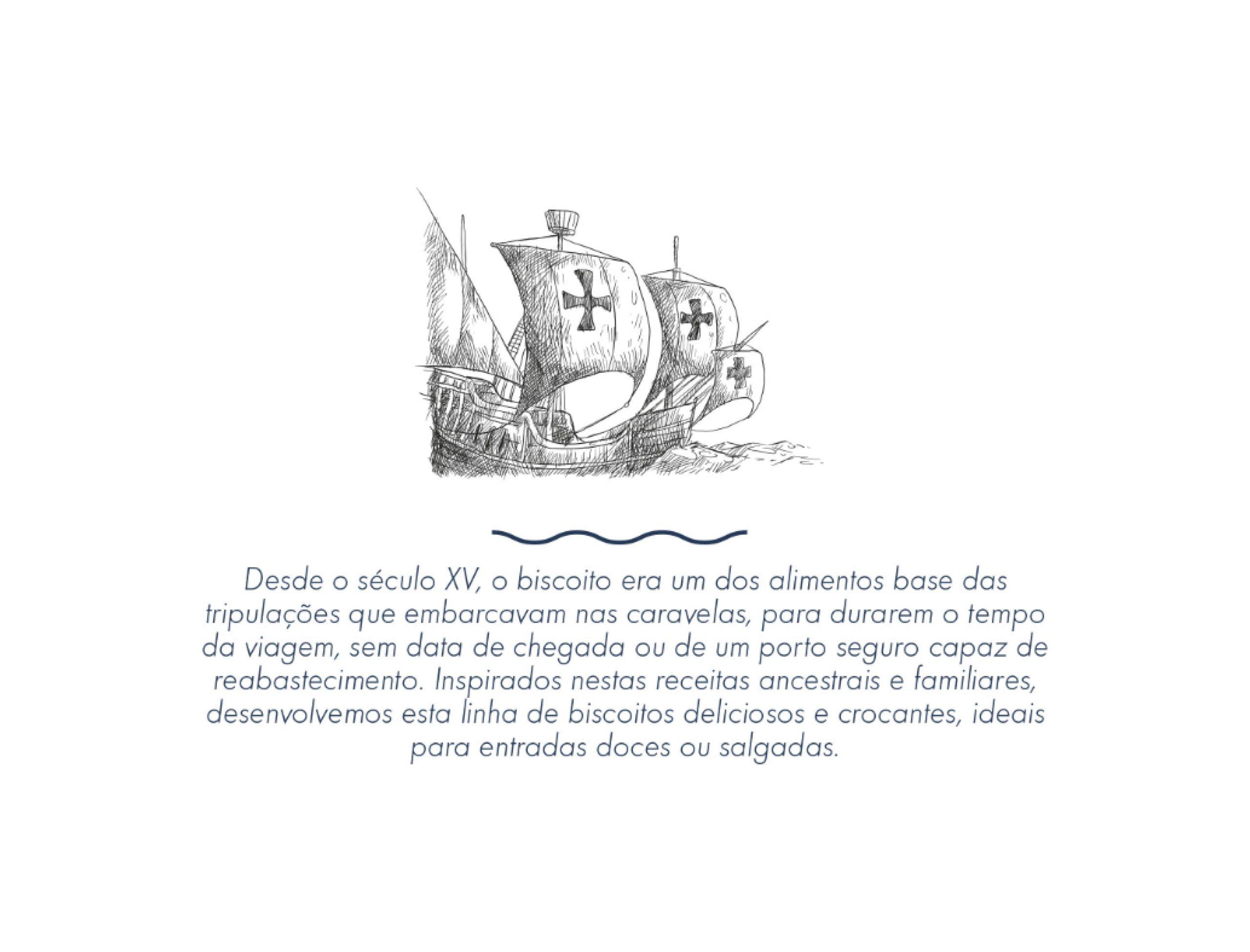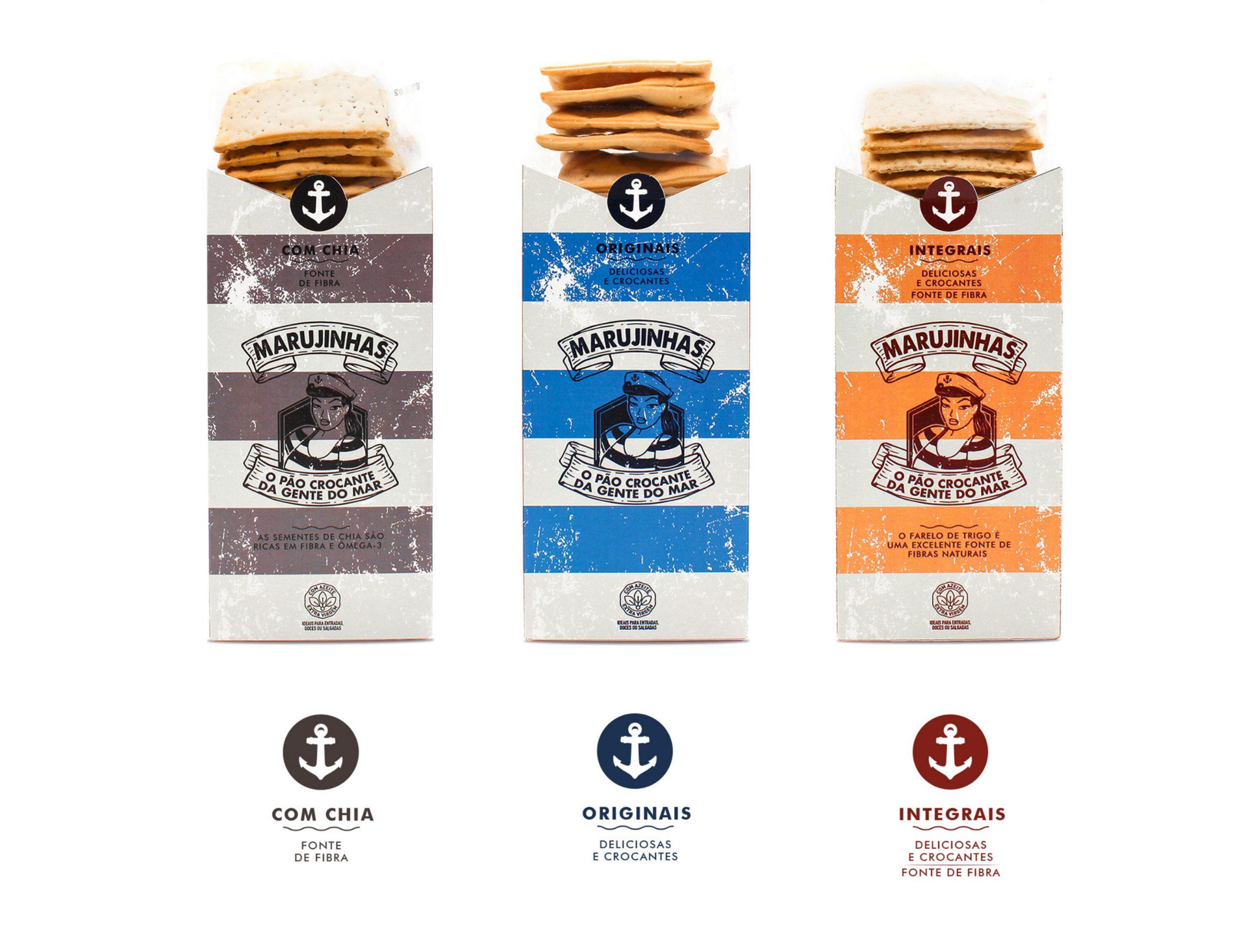 O objetivo foi transmitir o universo marítimo através de ilustrações manuais, paleta cromática inspirada no oceano e texturas propositalmente desgastadas, evocando o ambiente rústico dos antigos navios. Foram criadas três variantes — Originais, Com Chia e Integrais — com códigos de cor distintos para facilitar a identificação em ponto de venda. O formato da embalagem valoriza o produto e destaca a proposta “O pão crocante da gente do mar”.